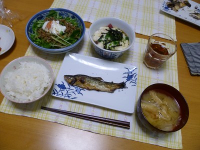 水菜とじゃこと温泉卵のサラダ。昔、某居酒屋チェーンで食べてから、気に入って時々作っています(笑)。ちょっと温泉卵を固めすぎたかな・・。難しいですよね・・これ・・。